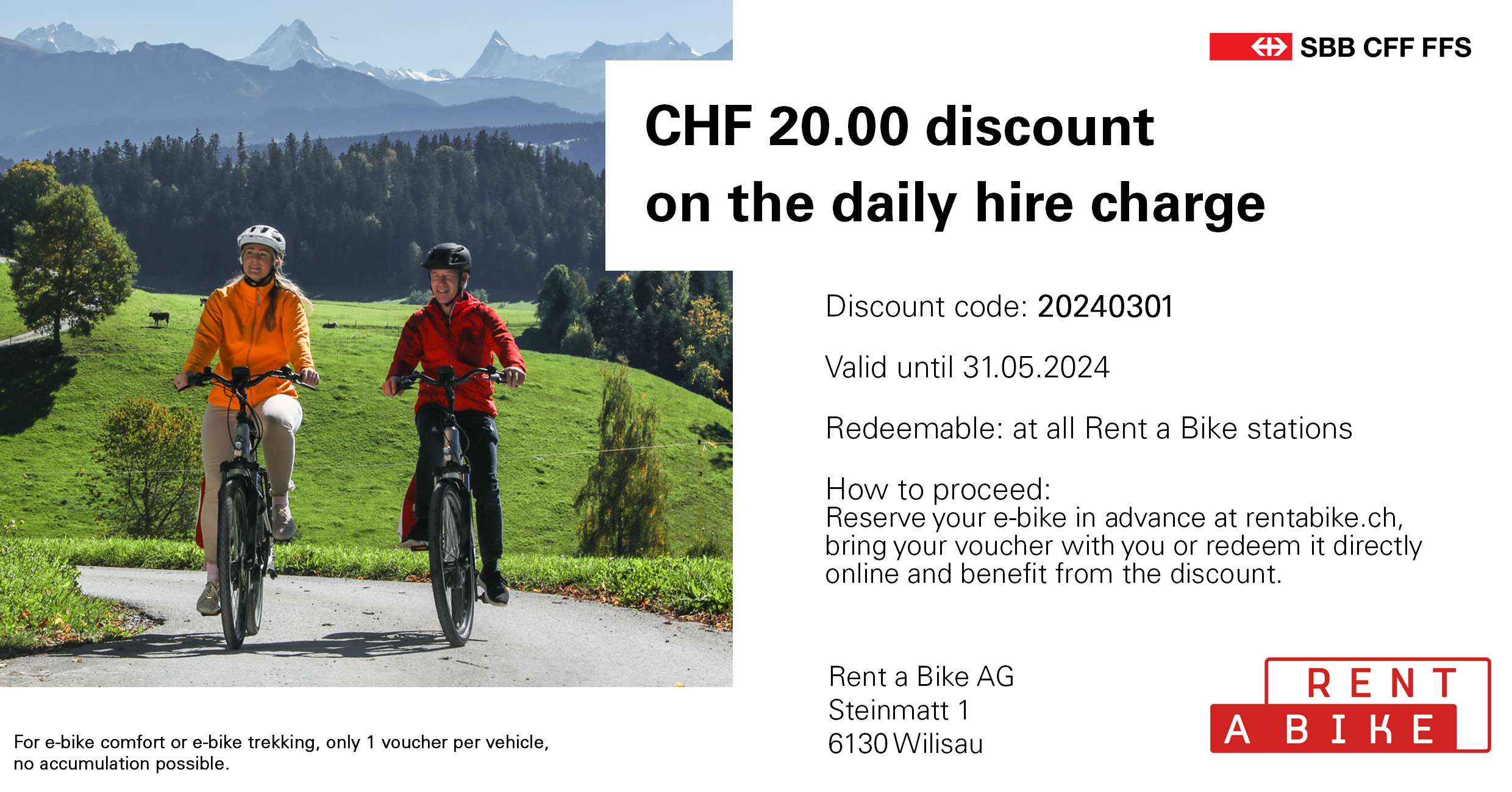 - The Voucher can be redeemed at all Rent a Bike stations for an e-bike Comfort or Trekking.